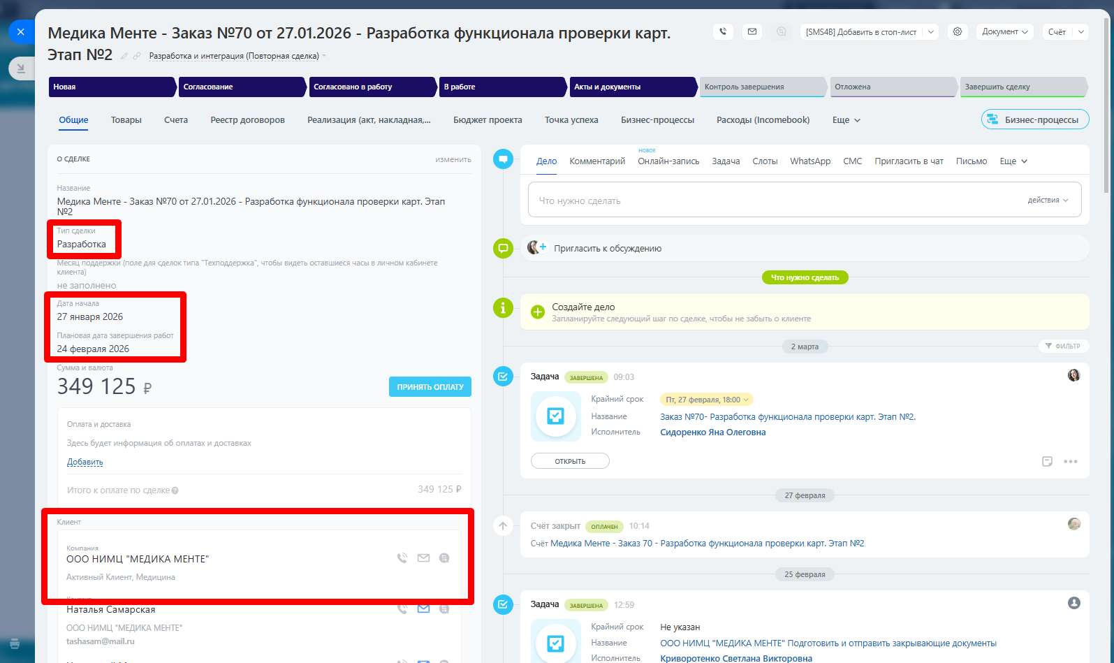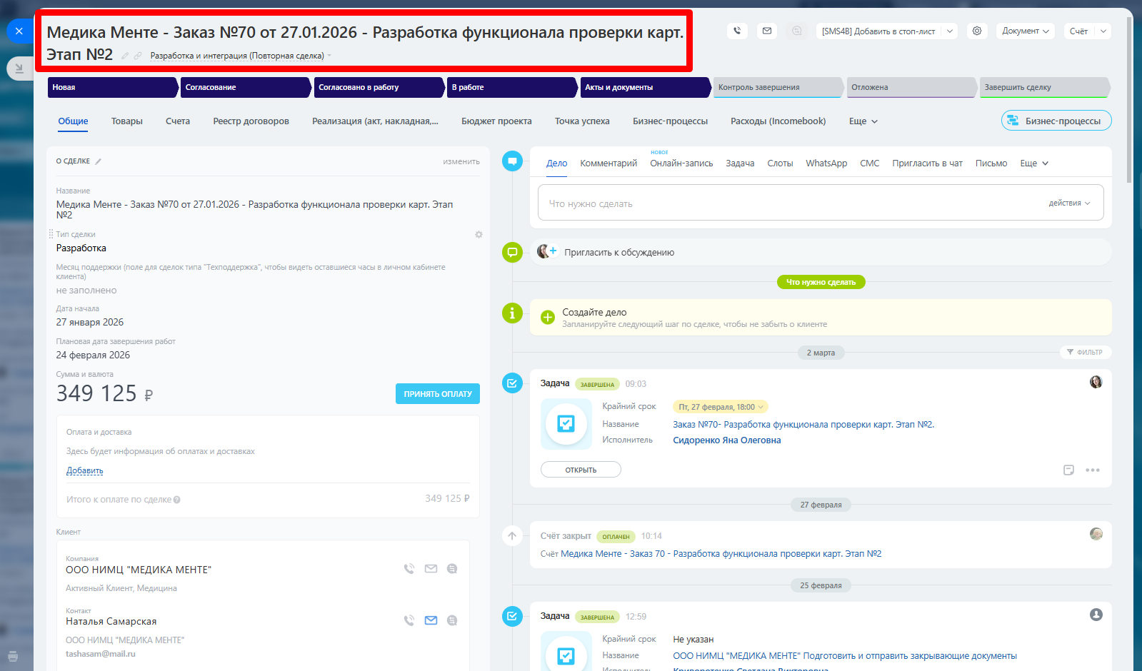 Например: (Заказ №70 от 27.01.2026 - Разработка функционала проверки карт. Этап №2)