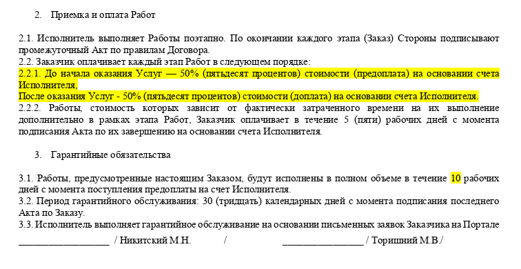 Если Сделка оплачивается 50/50 перед началом и по факту окончания работ - В скобочках в товарной строке добавляем приписку "Предоплата", а количество часов сокращаем вдвое