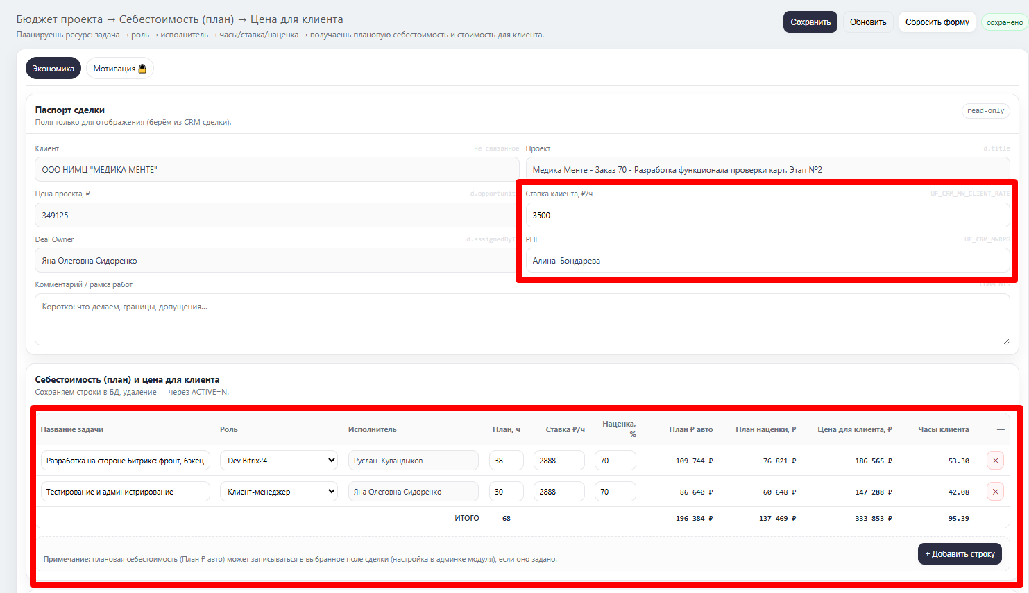 Что неудобно: для этой цели все данные опять копируются и переносятся в гугл-таблицы или ворд документ, где формируется уже смета для клиента. Самый оптимальный вариант - сделать возможность из Бюджета проекта копировать все в отдельный интерфейс Смета проекта, где данные будет возможно скорректировать уже под клиента, какие-то задачи объединить, чтобы клиенту было более понятно, что к чему, а затем уже эту смету автоматически пробросить в шаблон Заказа клиента - там все опять приходится дублировать и это отдельная большая боль.