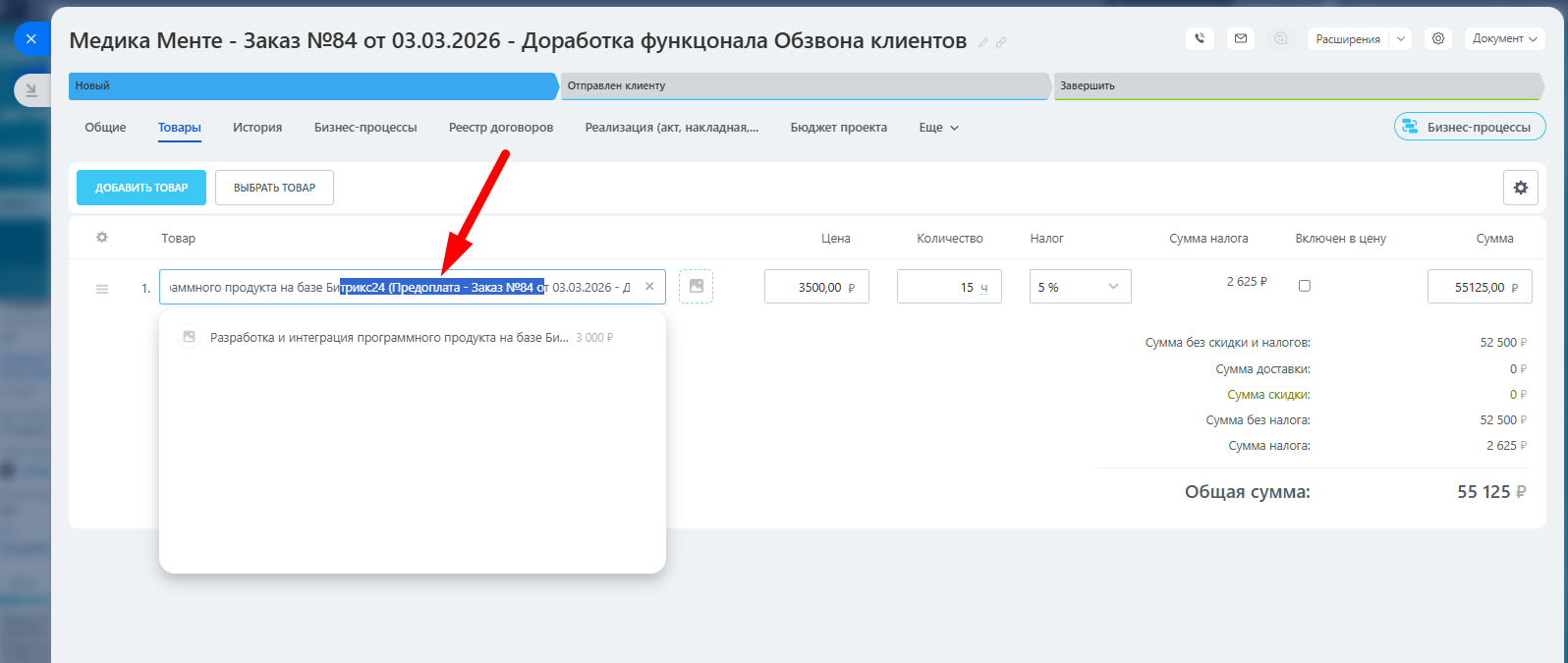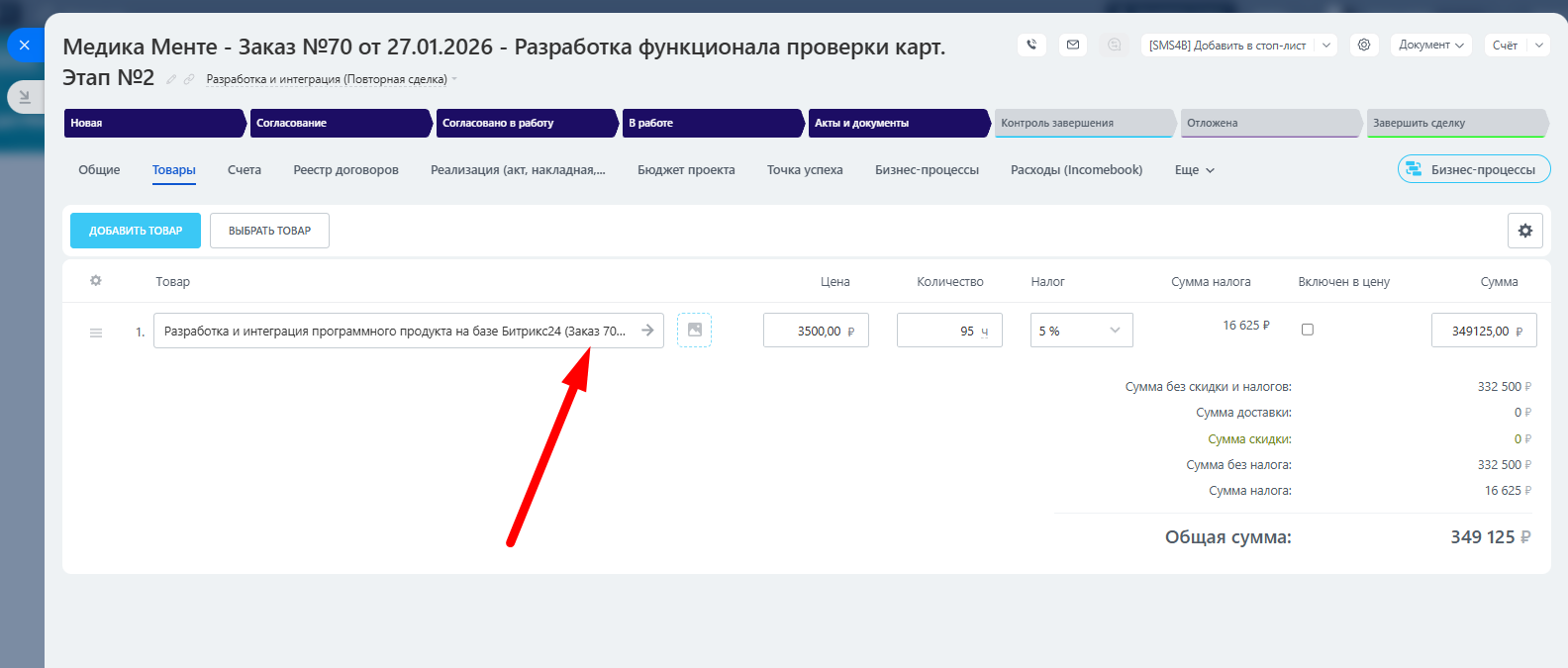 Выбираем товар Разработка и интеграция программного продукта на базе Битрикс24, далее в скобочках приписываем данные по формату: